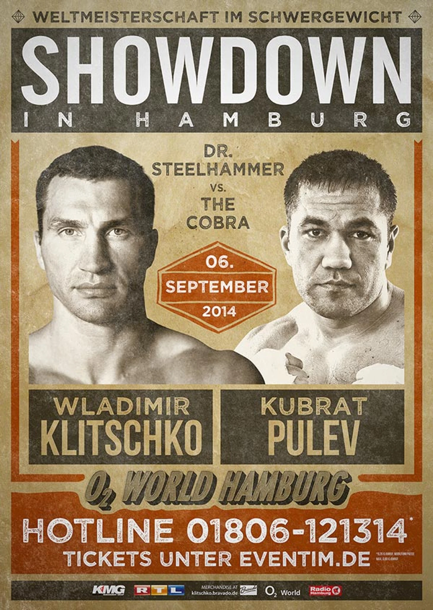 Официальная афиша боя между чемпионом мира в супертяжелом весе Владимиром Кличко и претендентом Кубратом Пулевым, который пройдет 6 сентября в Германии.