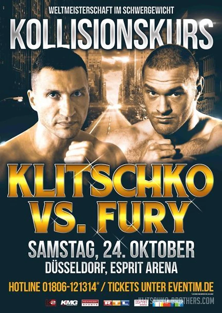 В интернете появился официальный постер к поединку между чемпионом мира в супертяжелом весе по версиям IBF, WBA, WBО, IBO Владимиром Кличко и официальным претендентом по версии WBО Тайсоном Фьюри, который состоится 24 октября в Дюссельдорфе, Германия.