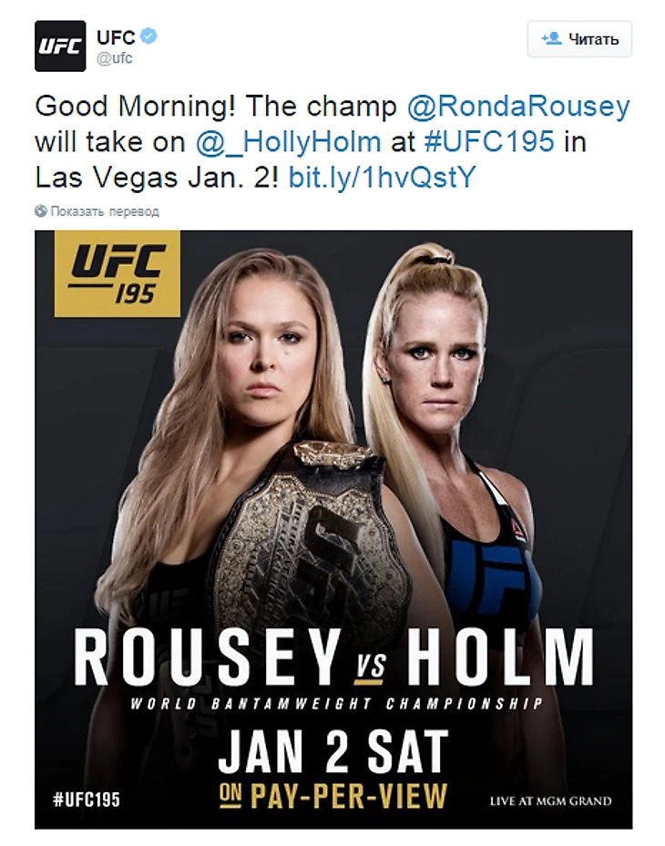 Обладательница женского титула UFC в легчайшем весе Ронда Раузи свой следующий поединок проведет против бывшй чемпионки мира по боксу Холли Холм.
