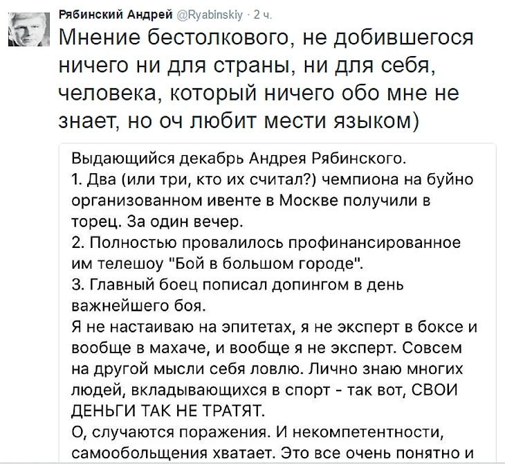 «Мнение бестолкового, не добившегося ничего ни для страны, ни для себя, человека, который ничего обо мне не знает, но оч любит мести языком)», – написал Рябинский в твиттере.