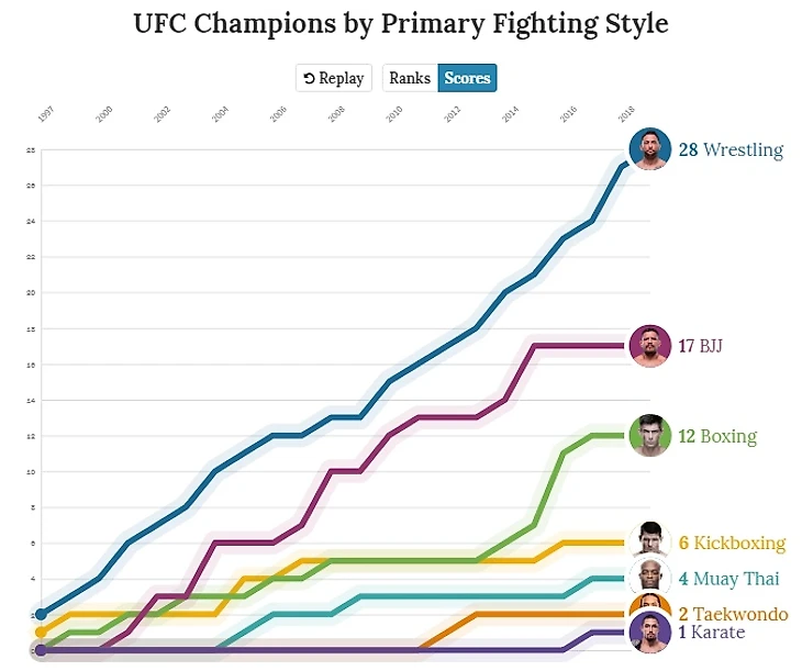 Из 70 чемпионов UFC с борьбы начинали 28 бойцов. 17 будущих чемпионов ставили себе базу на бразильском джиу-джитсу. Бокс выбрали 12 будущих обладателей пояса, кикбоксинг – 6, тайский бокс – 4, таэквандо – 2 и карате только один.