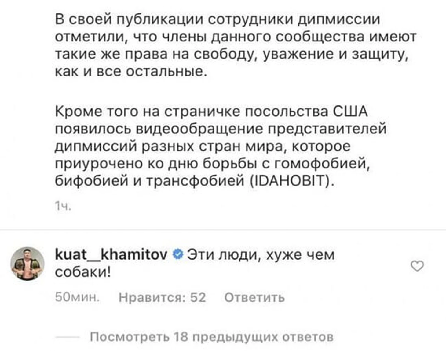 17 мая боец оставил комментарий под роликом в поддержку казахских представителей ЛГБТ, который записали дипломаты разных стран.
