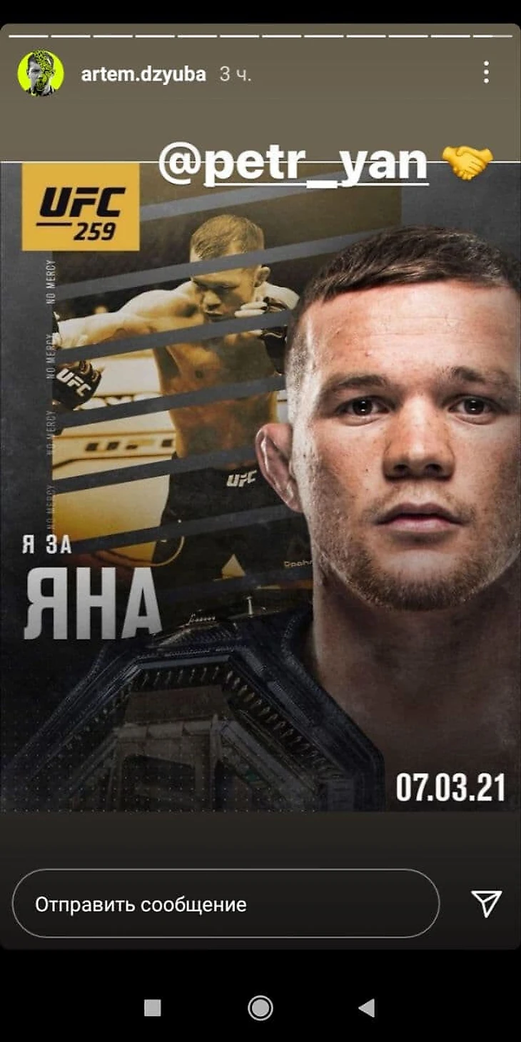 Нападающий «Зенита» и сборной России Артем Дзюба поддержал чемпиона UFC в легчайшем весе Петра Яна перед боем с Алджамейном Стерлингом на UFC 259.
