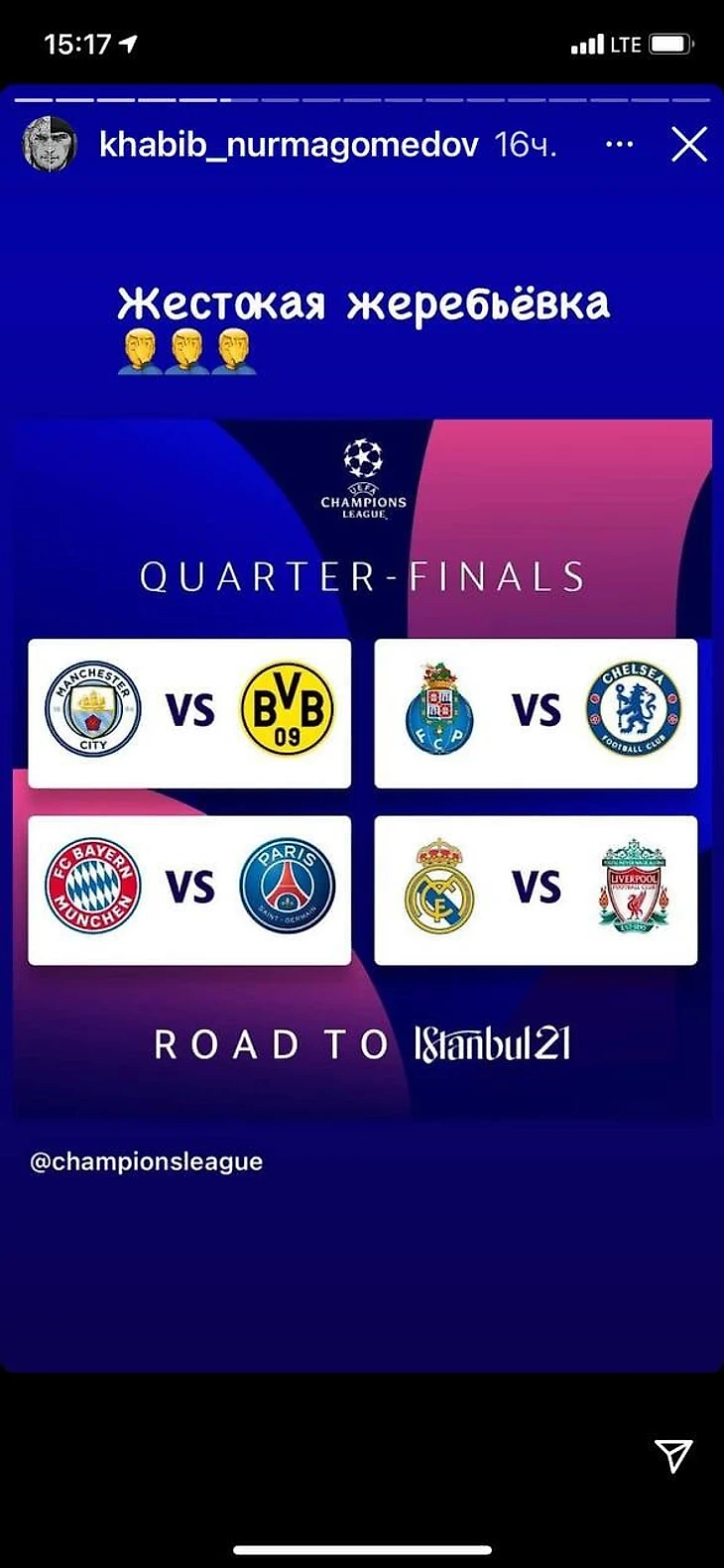 «Жестокая жеребьевка», – подписал фото боец с парами ¼ финала Лиги чемпионов.