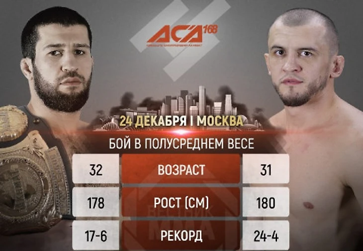 Турнир российской лиги АСА 168 запланирован на вечер воскресенья, 24 декабря 2023 года. в главном поединке Устармагомед Гаджидаудов и Альберт Туменов сразятся за титул чемпиона в полусреднем весе. Мероприятие будет проведено на арене «ЦСКА АРЕНА» в Москве.