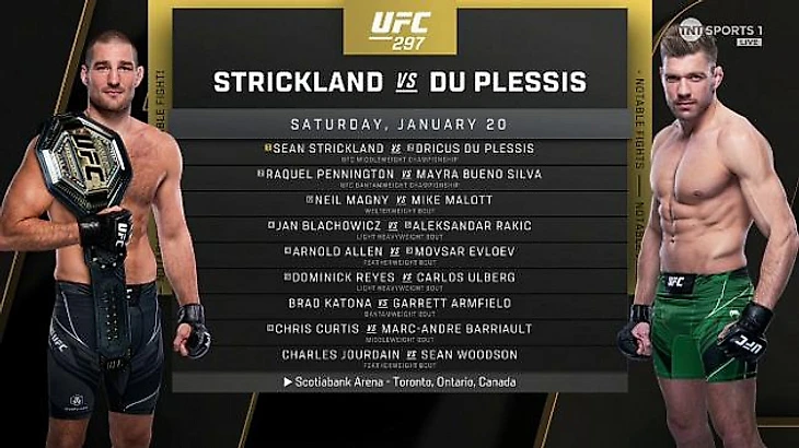 21 января 2024 года в воскресенье в Торонто, Онтарио, Канада, состоится турнир по смешанным единоборствам UFC 297 на арене «Scotiabank Arena». Главным событием вечера станет бой за титул чемпиона UFC в среднем весе между американским бойцом Шоном Стриклендом и южноафриканским спортсменом Дрикусом Дю Плесси.