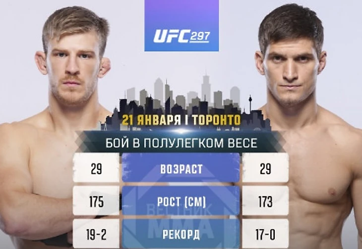В воскресенье 21 января 2024 года пройдет турнир по смешанным единоборствам UFC 297. Мероприятие будет проведено на арене «Scotiabank Arena» в Торонто, Онтарио, Канада. В основном карде состоится схватка в полулегком весе между Мовсаром Евлоевым и Арнольдом Алленом.