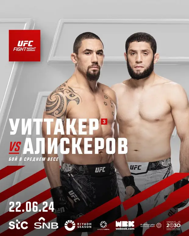 Вечером 22 июня 2024 года состоится турнир по смешанным единоборствам — UFC on ABC 6 в СА. Главным событием вечера должен был стать поединок в среднем весе между Хамзатом Чимаевым и Робертом Уиттакером, однако из-за травмы Чимаева пришлось искать срочную замену, на которую согласился Икрам Алискеров, также выступающий на турнире, который пройдет на арене «Kingdom Arena» в Эр-Рияде, Саудовская Аравия.