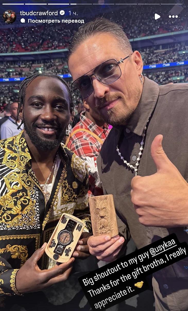 «Большое спасибо моему корешу Усику за подарок. Братан, я действительно ценю это», – написал в соцсетях чемпион мира по боксу Теренс Кроуфорд.