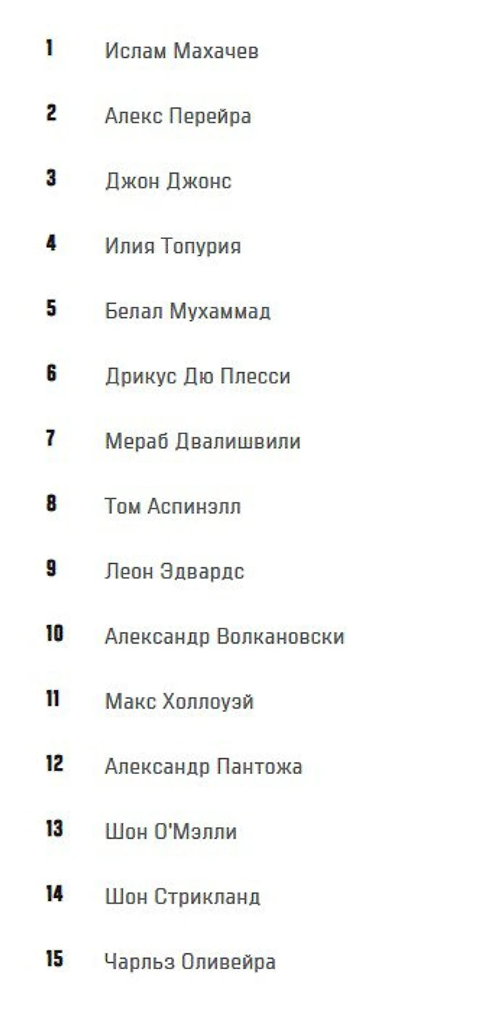 UFC обновил рейтинги дивизионов. В списке P4P положение бойцов осталось без изменений: лидер – чемпион в легком весе Ислам Махачев, второй – чемпион среди полутяжей Алекс Перейра, третий – чемпион в тяжелом весе Джон Джонс.