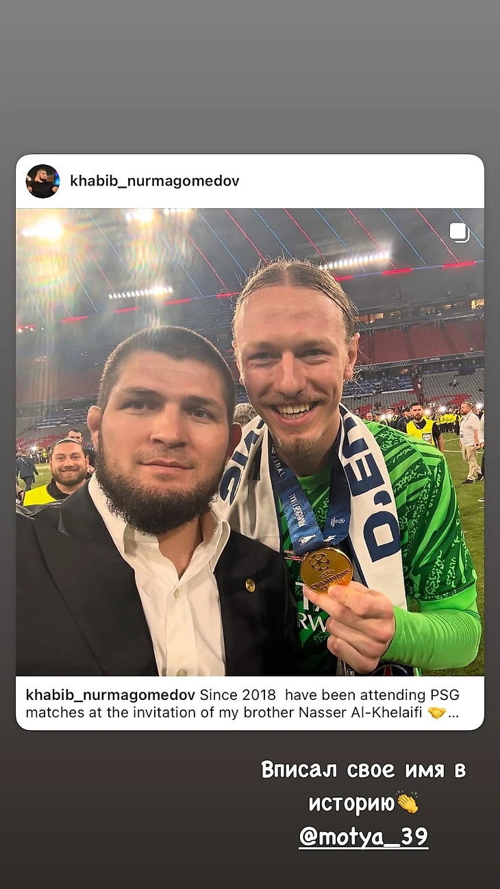 «Вписал свое имя в историю», – написал в соцсетях экс-чемпион UFC Нурмагомедов, выложив совместное фото с голкипером «ПСЖ» Матвеем Сафоновым.