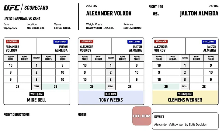 Судейские карточки боя Волков – Алмейда: Майк Белл отдал победу бразильцу