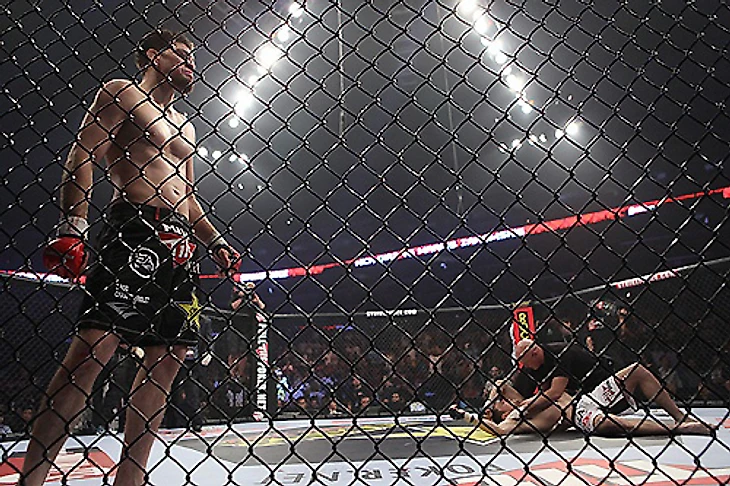 Так сразу и не вспомнишь, когда ход поединка менялся настолько резко, а победитель так умело маскировался за ударами соперника. Повезло ли Робби Лоулеру или это был такой сумасшедший расчет, но смотреть на то, что он сделал можно бесконечно. У Манхуфа сколько угодно проблем в партере, есть сложности с дисциплиной, но бить он умел всегда. Он этим и занимался, работая по Лоулеру, как по мешку где-нибудь в зале в Голландии. Превратив ногу американца в отбивную, Мелвин обосновался в середине шестиугольника и начал сериями расстреливать своего оппонента, только увлекся и забыл, что руки надо все-таки держать поближе к голове. Лоулер по-настоящему ударил впервые за бой, но этого оказалось достаточно: новичку Strikeforce сразу стало настолько нехорошо, что рефери поспешил вмешаться. СМОТРЕТЬ ВИДЕО