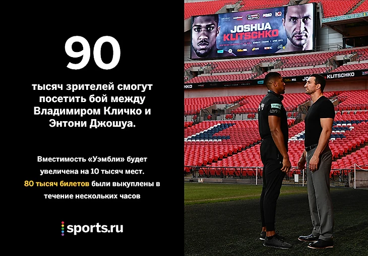 Организаторы боя за титулы IBF и WBA в супертяжелом весе между украинцем Владимиром Кличко и британцем Энтони Джошуа, который состоится 29 апреля в Лондоне, получили разрешение от мэра английской столицы увеличить вместимость «Уэмбли» до 90 тысяч человек, и теперь бой должен установить зрительский рекорд для боксерских поединков в Англии.