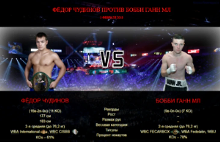 3 февраля в Сочи, состоится поединок – Фёдор Чудинов Россия vs Бобби Ганн мл.Бой за титул чемпиона по версии WBA International.Бой пройдет в андеркарте всемирной боксерской суперсерии, где главным боем вечера станет поединок Мурата Гасиева против Юниэра ДортикосаПодробности на сайте https://boxinggu.ru/afisha-boy-fyodor-chudinov-protiv-bobbi-gann-ml