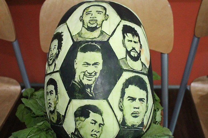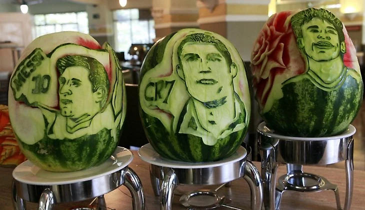 На самом деле "скульптура" - довольно громкое слово, поскольку речь идет об изображении лиц спортсменов на поверхности арбуза. В разное время Маурисио успел нанести на арбузы лица Марио Манджукича, Криштиану Роналду, Марио Балотелли и многих других.
