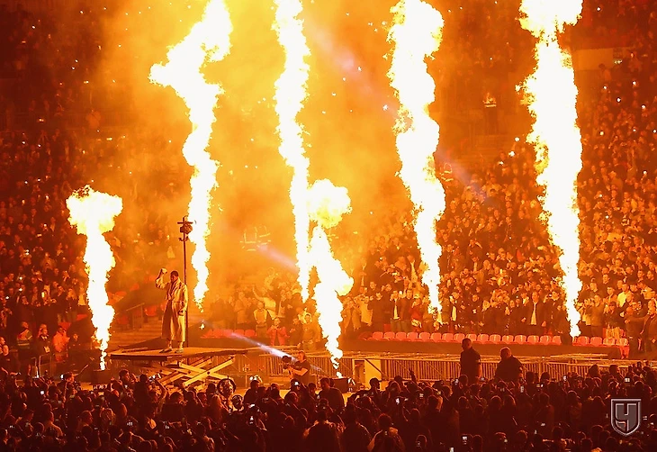 Его выход - настоящее шоу. В какой-то момент может показаться, что и боя-то не будет, до того все сделано красиво. Нам показывают рэпера, исполняющего свою песню вживую. Энтони поднимают на огромной платформе вверх. Все это происходит под свет мобильных телефонов, сверкают салюты, огненное шоу.