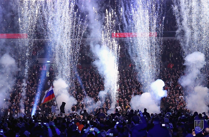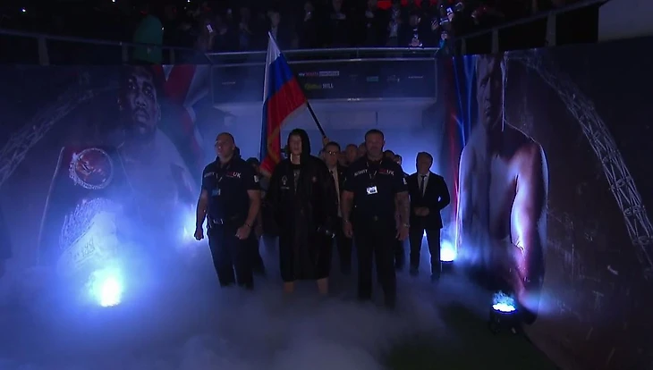Поветкин подпевает, он отлично знает текст песни, он выходил под нее много раз.