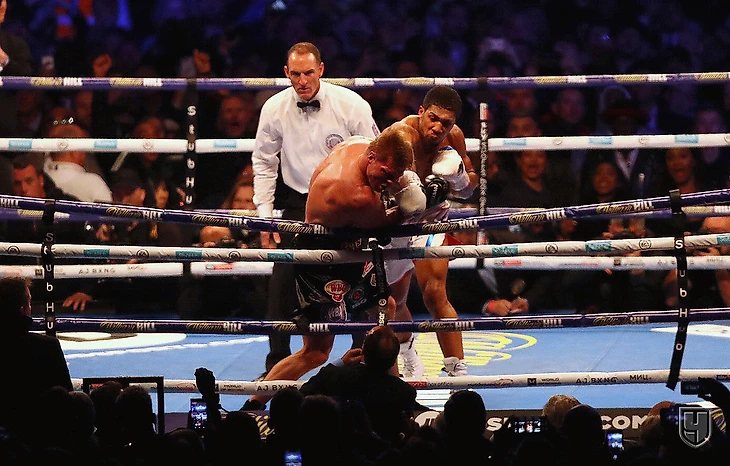 Развязка наступает в 7 раунде. Энтони наносит очередной удар левой в корпус и тут же правый в голову. Александр был к нему не готов, видно, что удар попал как надо. Джошуа выбрасывает удары, чтобы добить потрясенного соперника. В моменте он попадает левой в голову и добавляет туда же правой.