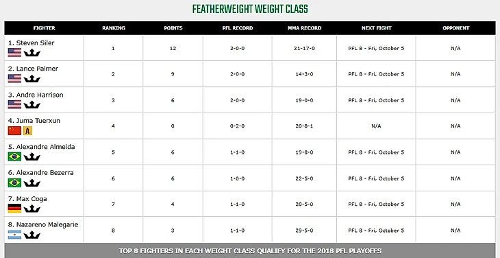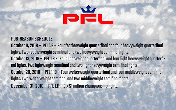 Сезон PFL 2018 года состоял из семи регулярных сезонных событий, которые проходили с 7 июня по 30 августа. А вот 6 октября уже стартует плей-офф и в канун нового года нас ждут титульные бои в каждом дивизионе.