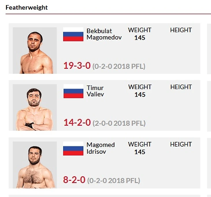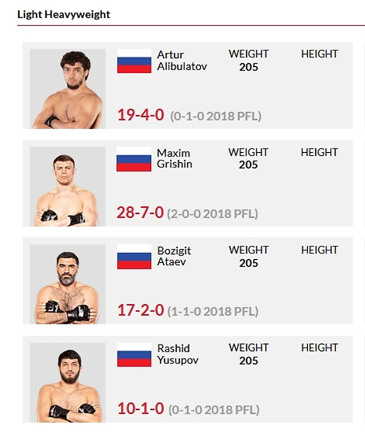 PFL проводит бои в 6 дивизионах, каждый из которых представляет свою отдельную мужскую весовую категорию: