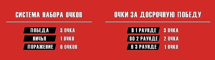 Во время регулярного сезона каждый бой состоит из трех раундов по 5 минут. А дальше самое интересное: на стадии плей-офф в ¼ финала бой длится всего два раунда по 5 минут, в ½ финала бой длится три раунда по 5 минут. Почему так мало? А потому, что бойцы за одну ночь будут проводить сразу два боя – в ¼ и в ½ финалов.