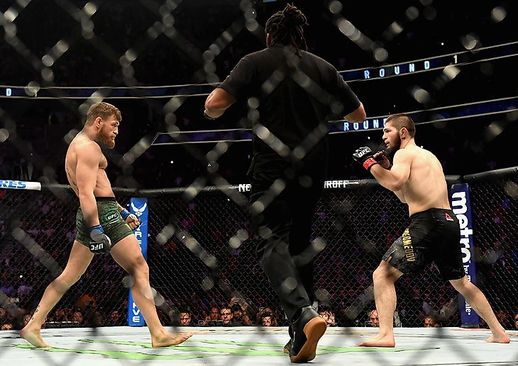 Уже во втором раунде Хабиб попал по Конору правым оверхендом и отправил в нокдаун. Ирландец мгновенно поднялся, но глаза у него потухли: он только что целый раунд беспомощно пролежал под Хабибом, а теперь выглядел так же беспомощно на своей территории, в стойке. Когда Хабиб тут же пошел с ним в размен, стало понятно, что ирландцу уже ничего не светит: какая-то очень важная часть его мощи так и осталась на настиле центра октагона.