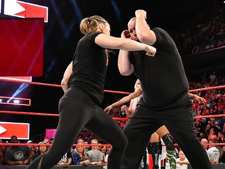 Пожалуй, стычки чемпионки Ронды Раузи с охранниками-мужчинами - наименее вдохновляющий пример из тех, что я привожу в данной заметке, но оставить его без внимания я просто не могу. В данном случае, мы видим скорее иллюстрацию разрушительной практики и неправильного использования интергендерных эпизодов. Такие моменты явно призваны подчеркнуть баланс силы, напомнить о том, насколько Ронда суровая и беспощадная, и как раз поставить ее над женским дивизионом. По иронии судьбы, самая токсичная интерпретация интергендерного рестлинга - она же и самая заметная и наиболее прямо демонстрируемая на основных брендах.