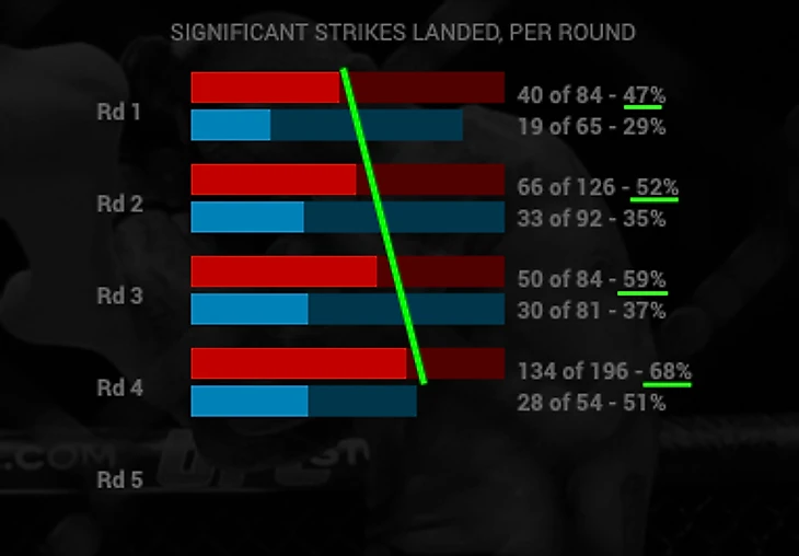В четвертом раунде Холлоуэй работал как отбойный молоток: попал по Ортеге 134 значимыми ударами из 196 выброшенных – это 68-процентная точность и невероятная интенсивность для смешанных единоборств. По ходу поединка бойцы устают, по ним легче попасть – неудивительно, что с раундами точность растет. В случае с Максом удивляет бешеный темп.