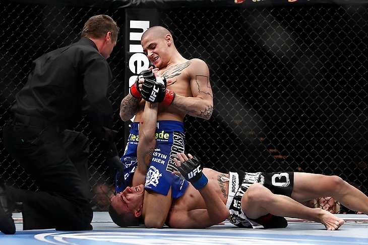 Макс жаждал зарубы. С этого он в принципе и начал. Удары коленями и преследование Порье. Минимум аккуратности, максимум агрессии. Как итог, Дастин через две минуты после начала боя перевел все дело в партер. Холлоуэй попробовал выбраться из лап соперника, но допустил фатальную ошибку: Дастин завладел его рукой и начал ее заламывать. Победа сабмишном была обеспечена.
