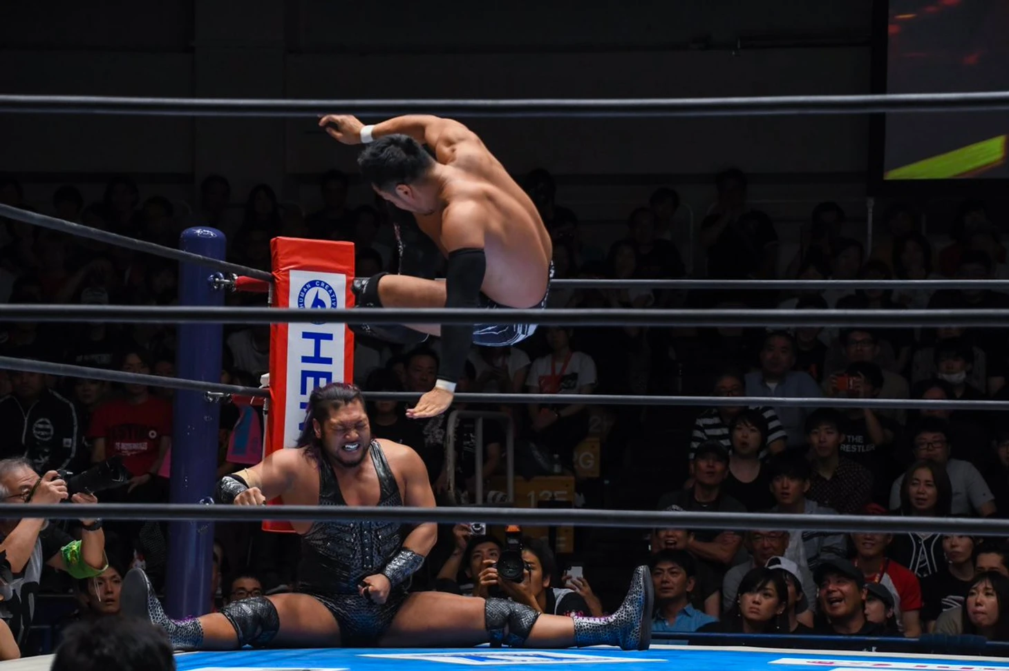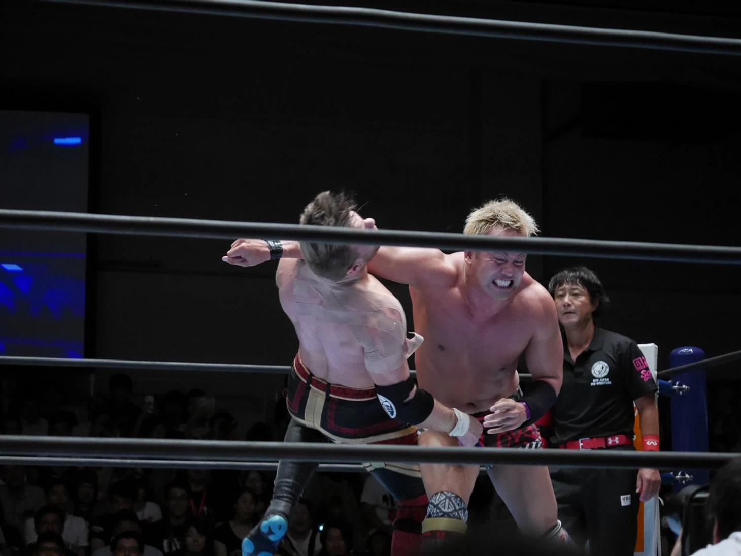 После достаточно классического начала, в котором никто не сумел завладеть преимуществом, исполнители решили поиграть на публику и выяснить, кого любят больше. В итоге, фанаты поддержали обоих одинаково, и рестлинг продолжился. Paradise Lock у Ибуши не прошел (все на этом турнире прям мечтают провести САНАДЕ его собственный захват), и САНАДА отправил оппонента за пределы ринга, однако не стал прыгать на него дайвом. Кота влетел в ринг со своим миссл дропкиком, после чего завладел контролем на время, однако нога давала о себе знать. Мунсолт САНАДА встретил коленями, а затем серией атак отправил оппонента за пределы ринга, полетев на него свооим кроссбади. В ринге Ибуши отбился от суплекса, получил коленями, и смог поймать оппонента пауэрслэмом, за которым прошел мунсолт со второго каната. Серия киков сменилась обменом сворачиваний, САНАДА решил начать работу над травмированной ногой соперника, но тот встретил попытку дропкика в колено двойным стомпом. Из затяжного обмена ударами победителем вышел Ибуши, благодаря отличному лэриэту, за которым прошел Last Ride до 2. Kamigoye не прошел, и САНАДА поймал оппонента на его же коронный прием, но мунсолт не задался, и Кота шарахнул Boma Ye, и вновь нога дала о себе знать. САНАДА поймал Ибуши в Skull End, за что «Golden Star» впечатал его лицом в угол ринга. Суплекс у Коты не прошел, но он провел Пеле Кик, на что оппонент ответил спин киком и Skull End Swing. Кота нашел ответ в виде жесткого хай кика. Boma Ye до 2, и Ибуши, сняв защиту с колена, добил оппонента своим Kamigoye.
