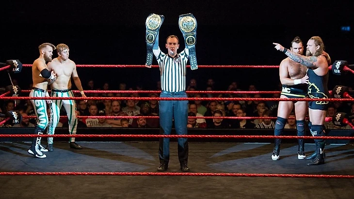 Начали матч чемпионы с синхронных дропкиков и дайвов через третий канат на оппонентов. Коффи попытался отбиться, но получил еще и суисайд дайв от Эндрюса. В ринге он получил командную атаку, а Вольфганг, который попытался прийти на помощь, просто был отправлен за пределы четырехугольников. Еще одна командная работа от Марка и Флэша, и Кроссбади с угла Эндрюса Коффи перевел в скуп слэм, что позволило перехватить инициативу. Валиец попробовал отбиться, но Вольфганг принял «слепой» тэг, и Gallus зашли на командную работу. Пока шотландцы доминировали, часто меняя друг друга в ринге, на стэйдже появился Джо Коффи, решивший понаблюдать за происходящим в живую. Тем временем Эндрюс умудрился реверсировать атаку соперника, передав тэг Уэбстеру. Тот тт же отвесил несколько страйков Марку, добавив мунсолт, затем отбился от Вольфганга, проймав его харриканраной. Энзигури в затылок Коффи и харриканрана на рингсайд Вольфгангу. Swanton Bomb провести не получилось, так как «Вульфи» стянул напарника с ринга, так что Морган полетел на них саммерсолт сентоном за пределы четырехугольника. Что-то очень похожее на Destino Марк Коффи получил в ринге, а затем и командная работа прошла, но только до 2. Тэг Флэшу, но Вольфганг остановил его, впечатав в апрон. Марк тем временем нейтрализовал Эндрюса, и «легальному» Уэбстеру достался чокслэм в ринге, а затем еще и самоан дроп с мунсолтом, но удержание разбил Эндрюс, параллельно задев судью, который, почему-то, вопреки канону, не вырубился. В следующем эпизоде Коффи достался мунсолт с апрона на рингсайд от Эндрюса, а потом, получив тэг от уставшего напарника, принялся забивать Вольфганга в ринге. Тому на помощь поспешил напарник, но даже вместе они не сумели составить оппозицию валийцу, который затем передал «слепой» тэг Уэбстеру, и тот одарил «Короля Шотландии» коленом, когда тот собрался атаковать Эндрюса. Коффи «съел» энзигури, хэдбатт от Моргана, но отбился от чемпионов двойным клоузлайном. Какое-то время парни отходили, затем составы сменились на 2 Марков, но в ринге драку устроили все четверо. Попытка командной работы от претендентов, но Марк перевел это дело в Stundog Millionaire Коффи, а Вольфганг и вовсе пал жертвой убийственной связки из реверс харриканраны и колена. Swanton Bomb а спину «легального» Коффи, но лишь до 2. Попытку суисайд дайва на себя от Эндрюса Вольфганг перевел в бросок в стойку ринга, а Уэбстер отбился хэдбаттом от Коффи. Попытка сплэша в 630 градусов от Флэша, однако мимо, «Вульфи» забрал тэг и провил гарпун сопернику. Связка из кика и пауэрслэма, и Gallus стали новыми чемпионами. Все трое празднуют, и теперь официально могут заявить, что, по крайней мере, командный дивизион — это их королевство.
