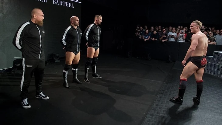 Начали матч Айкнер и Примат, и начали его сразу же с жесточайшего обмена панчами, победителем из которого вышел Фэбиэн. Примат же быстро отбился, запустил оппонента в угол, передал тэг напарнику, и Айкнер моментально отбился от Вепря, отправив в матч Марселя. Тот, в свою очередь, тут же попал под чоп блок и сентон на спину. Передача права ведения боя Примату, и командная работа. Бартель укатился за пределы ринга, а в четырехугольник залетел Бартель, который попытался оказать сопротивление, но улетел к напарнику. The Hunt также оказались на рингсайде, где Вепрь получил скуп слэм, а Примат вернулся в ринг и стал вызывать Бартеля на честный бой. Тот не торопился, поэтому соперник полетел на Марселя суисайд дайвом, однако Айкнер спас соперника от этого дела, поймал визави и впечатал в стальные ступеньки. Затем Imperium вернулись в ринг с Диким Кабаном и стали его мучить, периодически меняя друг друга в ринге. Коронный синхронный дропкик в углу, но только до 2. Болевой от Бартеля, но Кабан отбился, перекинул соперника через себя, провел seated senton и передал «горячий» тэг Примату. Тот принялся разносить обоих оппонентов, провел Айкнеру эксплоудер, но Бартель сорвал синхронные хэдбатты с углов. Затем Фэбиэн передал «слепой» тэг товарищу, и мы увидели коронную связку из спайнбастера и РК, после чего прошел еще и слэм до 2. От еще одной командной работы Примат отбился, проведя Айкнеру гарпун, после чего оживился и Вепрь, нейтрализовавший Бартеля. Коронные хэдбатты, удержание, и Марсель стащил Примата с ринга. Вепрь стал возмущаться, за что получил убийственный Саито суплекс от Айкнера, а затем «легального» Примата в ринг, добив его Европейской Бомбой. Предсказуемая победа Imperium.
