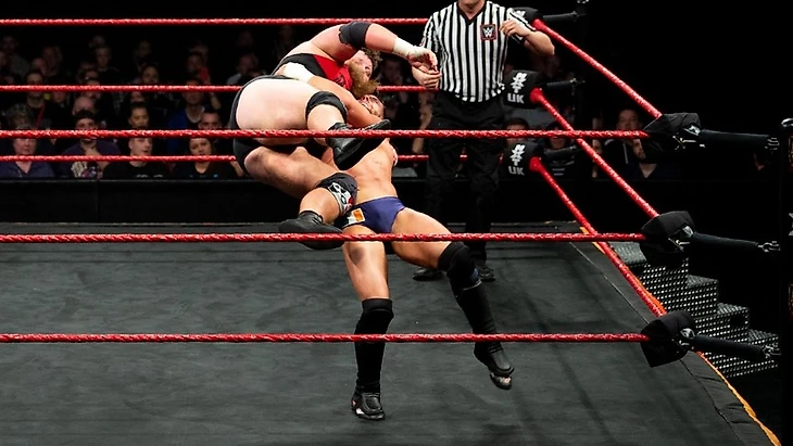 "Irish Ace" не стал ждать и атаковал "Бомбера", после чего через секунду дали гонг. Дэйв тут же заглушал напор Эйса и заставил его сойти с ринга. Мастифф кинулся вдогонку и Девлин поймал его с другой стороны ринга. Но Мастифф тут же начал опрокидывать бросками Девлина, не давая последнему шансов для контратаки. Далее Дэйв влепил апперкот и перебросил его через весь ринг в другой угол, но биг-бут и удар об канаты левой руки дали Джордану шанс - сразу же он атаковал Мастиффа standing-мунсолтом, но удержание только до 2. "Туз" NXT UK старался на этот раз наносить концентрированные удары, особенно на повреждённую руку "Бомбера" с максимальным давлением. Девлин работал по максимуму и не давал Дэйву возможности вернуться в строй для атаки - вскоре он закрепил крепкий болевой на левую руку, выламывая её. С трудом, но "Бомбер" смог поднять оппонента и провести back-drop драйвер - Девлин тут же принялся наносить панчи и локтевые страйки Дэйву, Мастифф смог ответить тем же и даже откинул Джордана belly-to-back суплексом, тем самым не дав ему атаковать Мастиффа новым болевым.