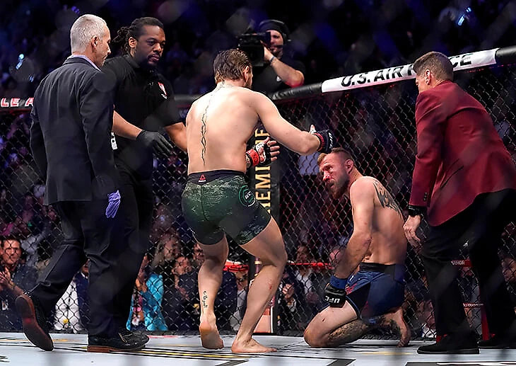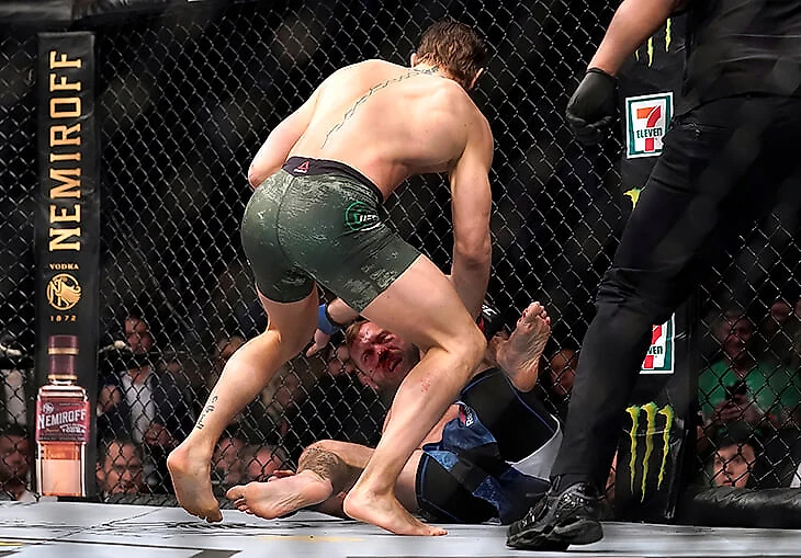 И на этот раз страх Ковбоя оправдался: Макгрегор моментально ворвался в клинч, нанес три удара плечами, после чего разорвал дистанцию и срубил Серроне хайкиком. Добивание – и все!