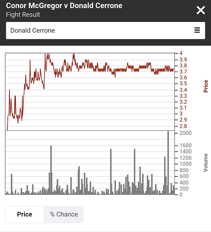 Сегодня утром по мск Макгрегор оформил быструю победу над Серроне, изучив статистику крупнейшей биржи ставок в Англии, стало ясно, что букмекеры ожидали такой исход. Изначально кф.на победу Серроне был выставлен на уровне 2.8 , но по мере того как все больше и больше игроков начали ставить на победу Макгрегора кф.только поднимался и за час до боя был на уровне 3.75. Всего на бой было поставлено более 3млн.$ (по данным биржи betfair) и 80% ставок было на победу ирландца. Кф.на победу Макгрегора просел с 1.58 до 1.33. Самая крупная ставка на победу Ирландца была 98000$ , на победу Серроне 2000$