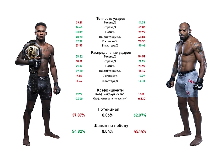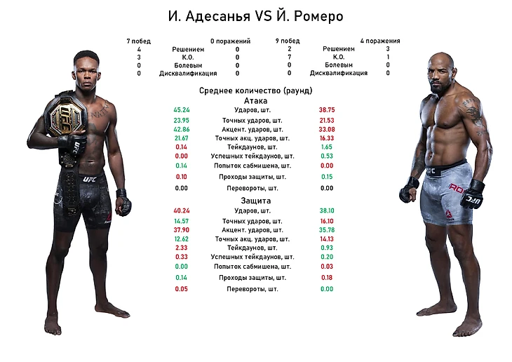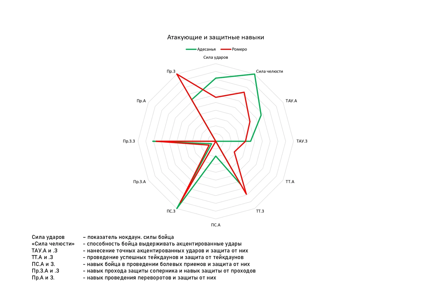 Вывод: По цифрам из отчета, Адесанья не обладает тотальным доминированием по показателям над Ромеро, и соответственно утверждать, что Адесанья победит в 7 случаях из 10 - это уже как-то перебор. Да, Ромеро сильнее как боец в ряде показателей, только продемонстрировать это на практике у него не всегда получается, и если дело дойдет до решения судей, то победу скорее всего присудят чемпиону (Адесанья). Да вот только вряд ли бой дойдет до решения судей, ведь исходя из результатов предыдущих боев, шансы выше на досрочное завершения боя (около 55%), чем на то, что бой дойдет до решения судей.