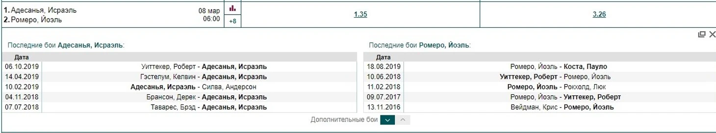 То есть шансы на победу по мнению букмекеров распределены следующем образом: Победа Адесанья - 74%, Победа Ромеро - 30%. Убираем 4% маржи, и получаем соотношение шансов где-то 70 на 30.