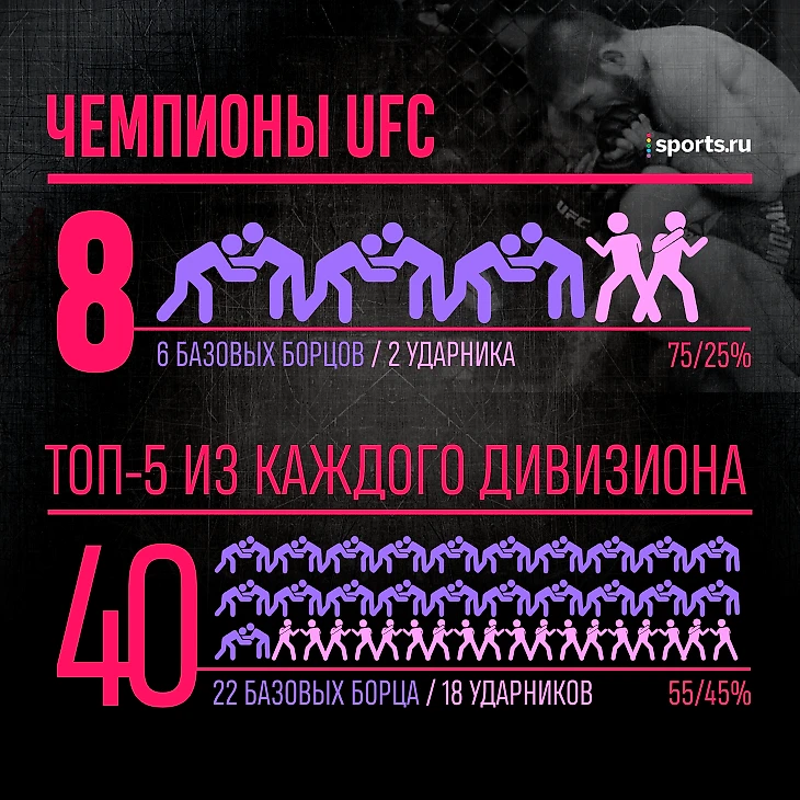 У борцов 6 чемпионских поясов UFC из 8. Скоро могут быть все, но в топ-5 дивизионов их преимущество небольшое: всего 55%