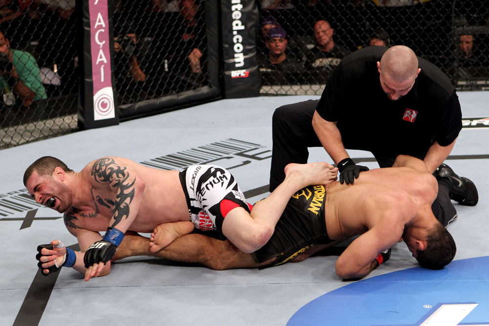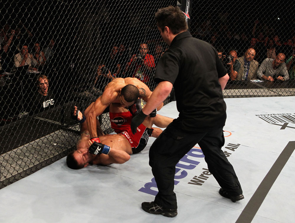 При беспрецедентной поддержке зала, вырвавшись из клинча у сетки, точнейшим ударом колена Хосе Альдо отправил Чада Мендеса на настил и успел приземлить еще один удар на лицо претендента, когда рефери остановил бой всего за секунду до конца первого раунда.