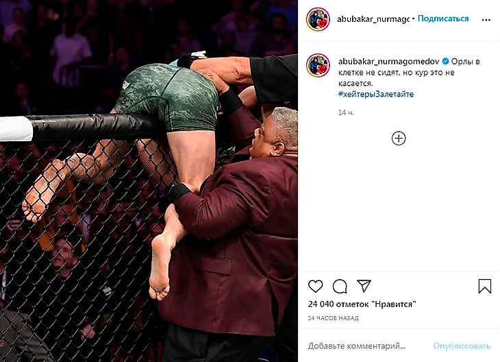 При чем тут Абубакар Нурмагомедов – двоюродный брат Хабиба? Уже два дня он не унимается в инстаграме. Сначала выложил фотографию, где Конор пытается выжить под Хабибом, подписав: «Это когда коронавирус и ты не можешь дышать». А потом – фото неудачной попытки Макгрегора перепрыгнуть ограждение октагона: «Орлы в клетке не сидят, но кур это не касается».