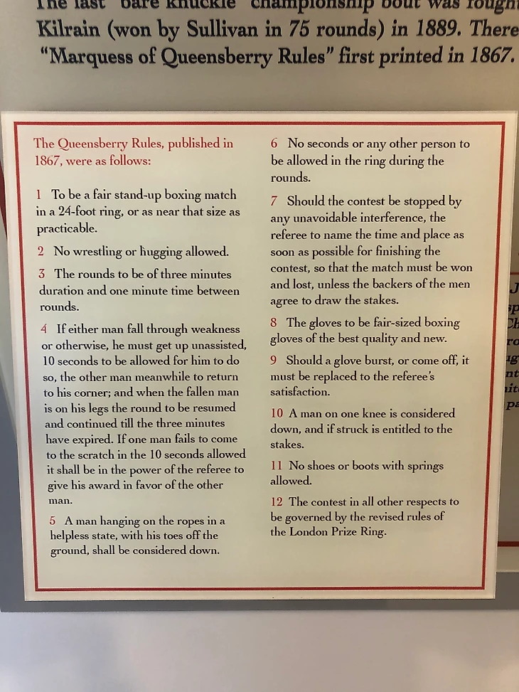 Экспозиция музея довольно-таки небольшая. Она включает в себя стенды с историей появления бокса и становления его как профессионального спорта. До середины XIX века не было унифицированных правил, боксеры не использовали перчаток, не существовало весовых категорий. В 1867 году маркизом Куинсберри был сформулирован свод правил, который впоследствии стал повсеместным. Свод включал в себя 12 пунктов, в которых устанавливались продолжительность раунда, экипировка боксеров, условия победы, запрещенные приемы.
