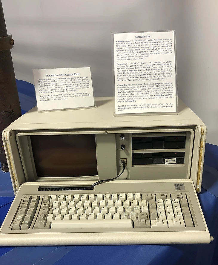 Еще один интересный экспонат – компьютер для подсчета статистики боксеров. За клавиатурой работали одновременно два человека, каждый следил за определенным боксером. Они пользовались четырьмя клавишами: нанесенный джеб, пропущенный джеб, нанесенный силовой удар, пропущенный силовой удар. После каждого раунда программа подсчитывала процент нанесенных ударов и выводила статистику для телезрителей.