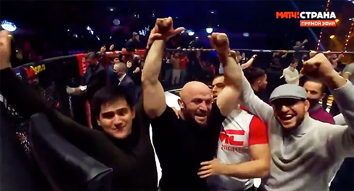 Исмаилов и его друг (в футболке с красными рукавами) бросились на Минеева, а когда бойцы завалились на землю, к ним присоединились зрители, запрыгнувшие в клетку. Кого била толпа – разглядеть трудно, но после того, как бойцов растащили, люди обнимали Исмаилова и победоносно вскидывали его руку.