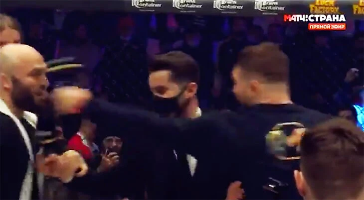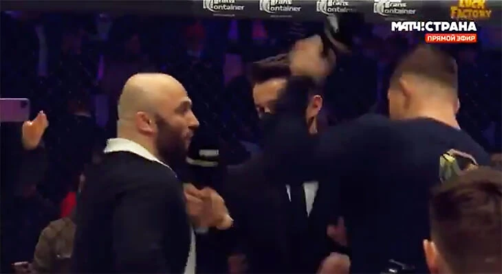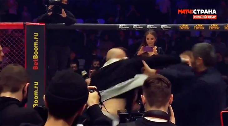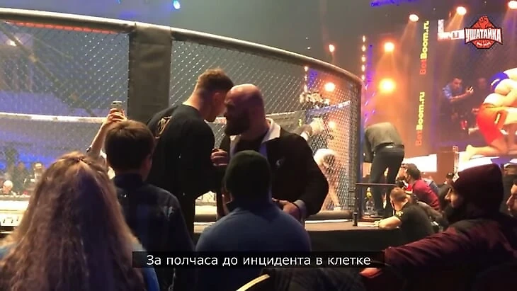 Диктор тоже пытался вмешаться – пожалуй, даже слишком интеллигентно: «Просьба всех успокоиться, выйти за клетку. Друзья, мы в прямом эфире – не позорьте Москву, не позорьте промоушен, пожалуйста. На нас смотрит весь мир. Будьте добры, держите себя в руках. Послушайте разум – не срывайте великолепный турнир. Покиньте клетку. Друзья, внимаю вас к совести и разуму – уймите эмоции, мы в прямом эфире, не позорьте себя на весь мир».