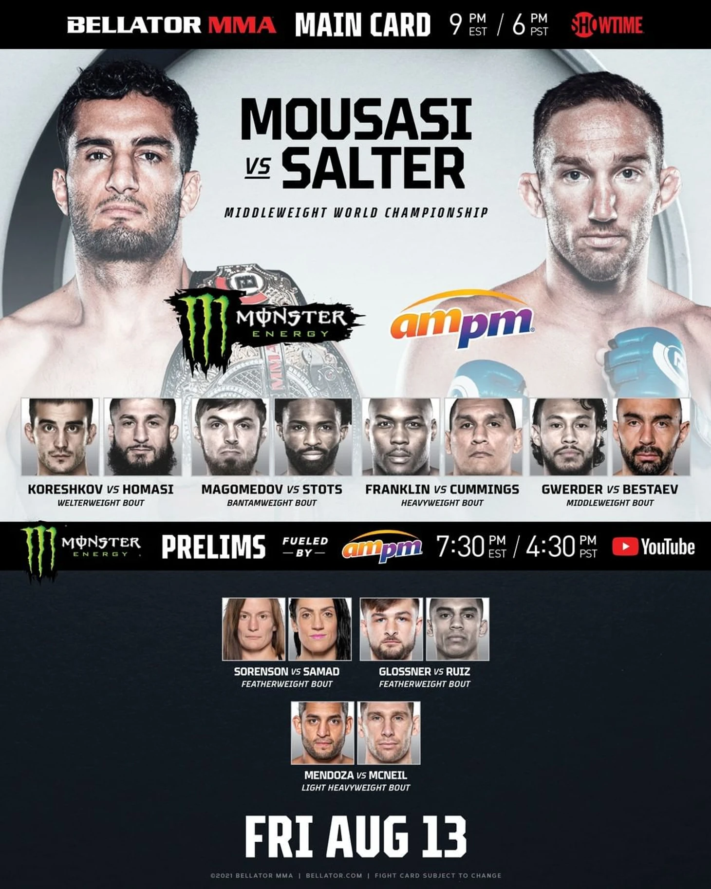 В основном карде турнира встретились Магомед Магомедов и Рауфеон Стотс. В первом раунде российский боец выбрасывал удары с разворота и одиночные удары ногами, а Стотс - джебы, но они редко достигали цели. Благодаря проходу ноги Супа (прозвище Стотса) первый раунд отдали ему. Во втором раунде "Тигр" совершал тейкдаун у сетки, а американский боец в свою очередь точнее работал в стойке. Третью пятиминутки бойцы поделили поровну. В первой половине Стотс поймал российского бойца на проходе ног и вышел на удушающий, но Магомедов сумел выбраться от туда. Далее "Тигр" захватил спину американца и хотел провести удушающий прием, но было безуспешно. В конце раунда российский боец хотел провести болевой рычаг, но гонг спас американца. Рауфеон Стотс выиграл Магомеда Магомедова единогласным решением судьев