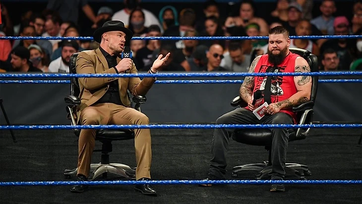 (А мне видимо одному показалось, что нас готовят к очному противостоянию между бывшим инди-рестлером и псевдобоксёром-блогером - потому что я вообще не понял к чему тут Корбин распинался? Мол понятно, что он сейчас выпендривается перед бывшими обидчиками, но если на прошлой неделе с Биг И это выглядело ну ещё относительно адекватно, то тут нечто аналогичного я вообще не увидел. Ну типа WWE так хотели показать "А мы тоже в теме насчёт того самого хайпанутого матча Пол-Вудли, давайте обсудим это" таким вот сегментом. Причём им было мало этого на прошлой неделе до проведения этого боя, когда происходил раскол между Мизом и Джоном Моррисоном. Так что для меня этот сегмент ну не принесёт ничего внятного - Корбин по-прежнему хулиган-хил с натянутой улыбкой, а КО по-прежнему получает люлей от фиг пойми кого);