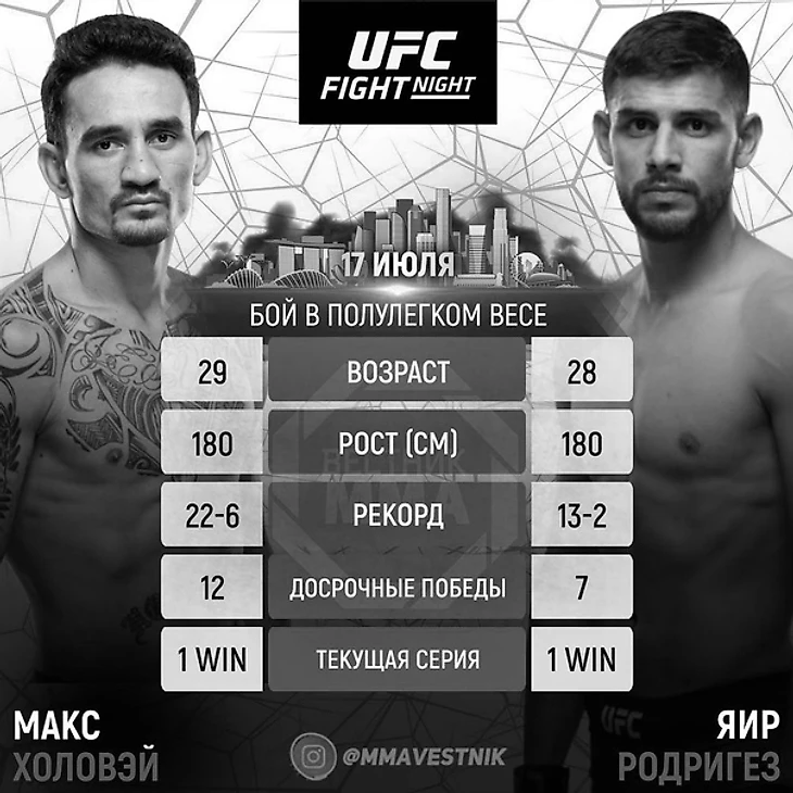 Спустя неделю после потенциально "боя года" между Гэтджи и Чэндлером состоится встреча Макса Холлуэя и Яира Родригеза. Переплюнуть бойню, которую устроили Джастин и Майк будет сложно, но если кто-то и может это сделать, то абсолютный рекордсмен UFC по количеству выброшенных ударов Холлуэй и зрелищный ударник Родригез