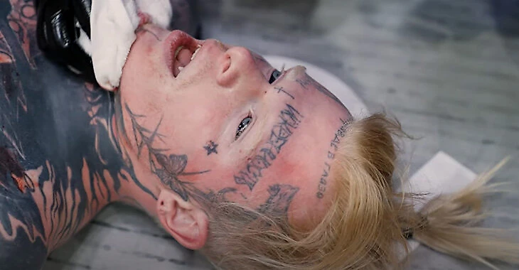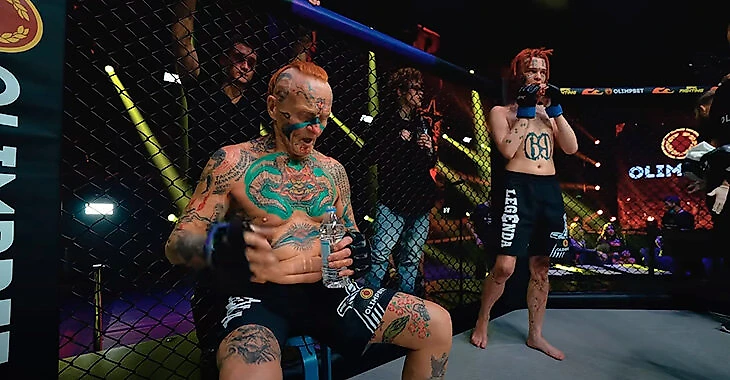 А в поединке – отправил в технический нокаут 22-летнего тату-мастера по кличке Даня Белый. И хотя парень в первом раунде доминировал в партере, во втором – сломался под напором Русского Тайсона. До боя Даня обещал вытатуировать пенис на лице соперника, но бесславно проиграл. Зато показал яркий стиль: у Белого почти все тело в татуировках, черные белки глаз, разрезанный как у змеи язык и многое другое.