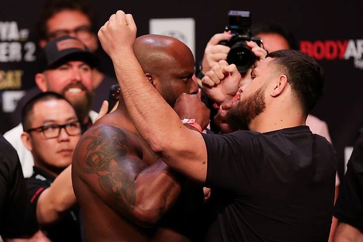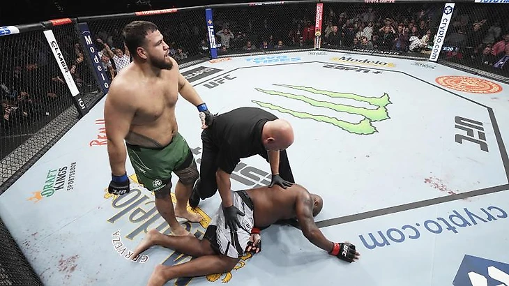 Эти двое стоят друг друга. Да чего уж там, где-нибудь в параллельной вселенной они наверняка стали бы напарниками. Например, могли патрулировать улицы в полицейской машине а-ля "Смертельное оружие". Если отринуть шутки в сторону, то у нас есть два тяжа с минимумом техники и стратегии, но максимумом избыточной силы и природной агрессии. Ещё на бумаге это противостояние тянуло на блокбастер. И парни не подвели! Рубка и хоккейный клин понеслись сразу после сигнала к началу битвы. "Чёрный зверь" бьёт всем, чем только можно, Туиваса отвечает. Раунд заканчивается. Во втором отрезке Деррик снова делает ставку на первобытную мощь, но и Туиваса заставляет считаться со своей самоанской силушкой. Сцепившись у сетки, Тай впечатывает короткий удар локтем в голову Льюиса. "Зверь" повержен. Охота выдалась удачной. Кроссовок пива нашему герою!
